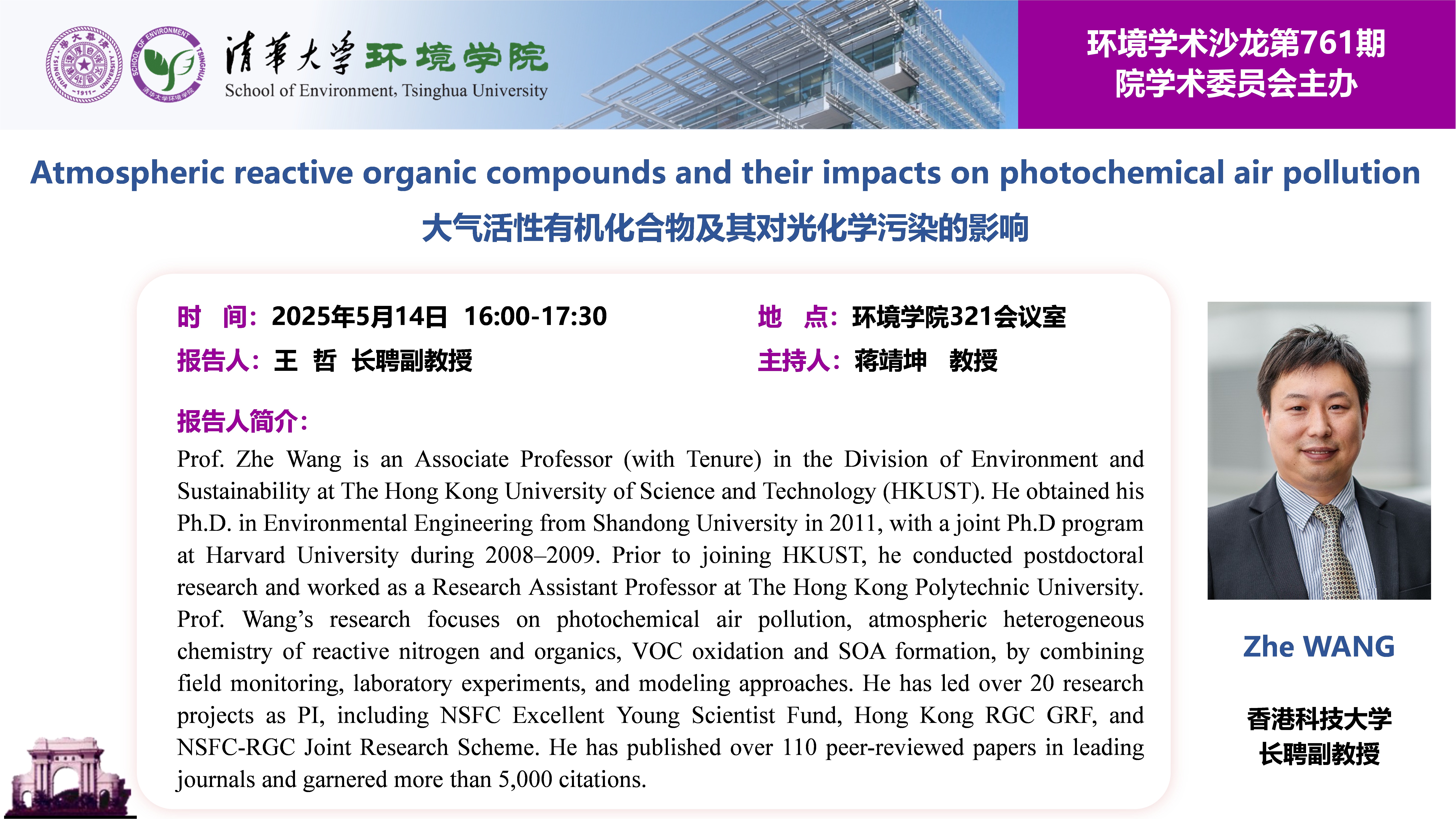 报告题目:Atmospheric reactive organic compounds and their impacts on photochemical air pollution/大气活性有机化合物及其对光化学污染的影响