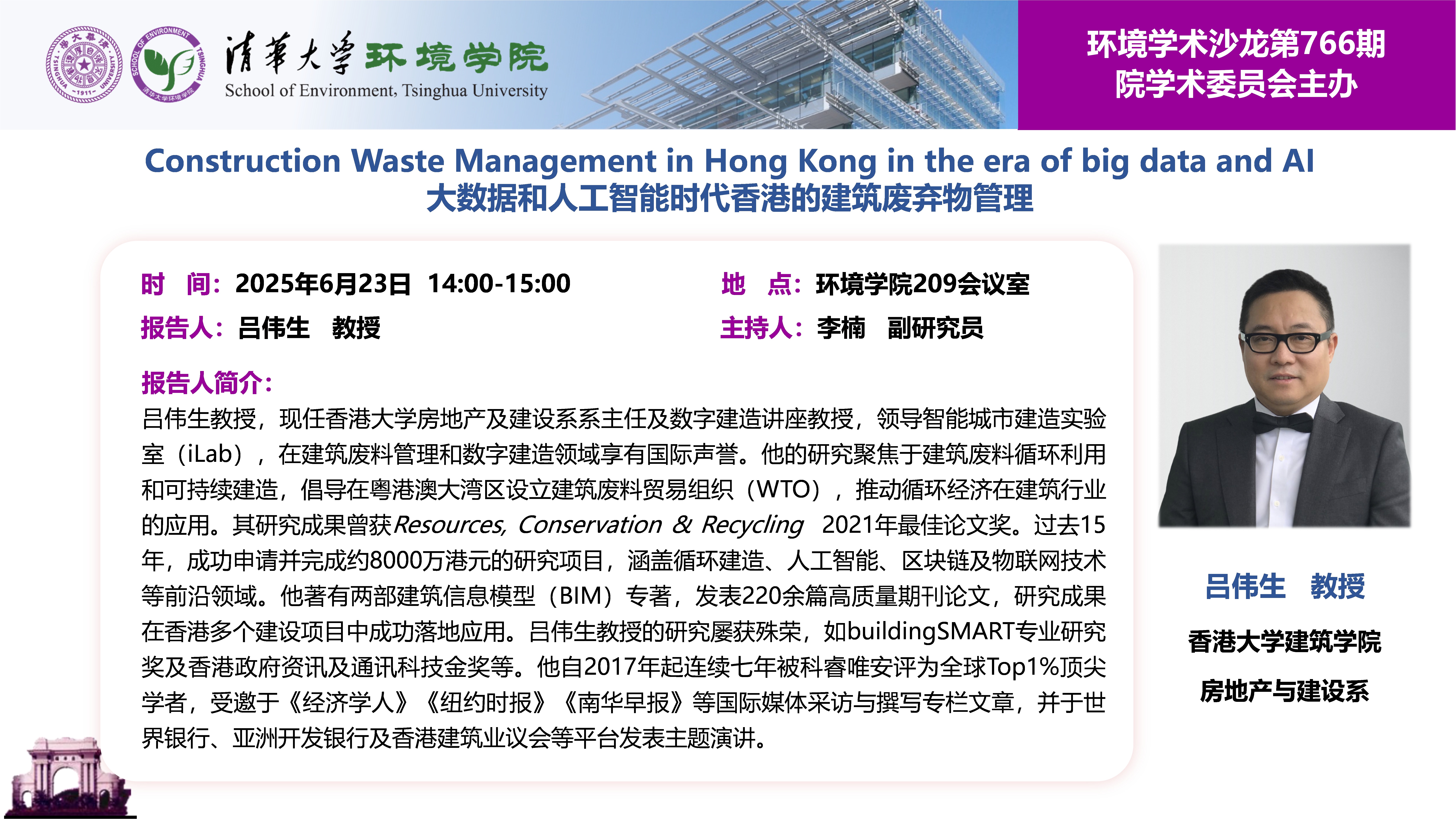 报告题目:Construction Waste Management in Hong Kong in the era of big data and AI/大数据和人工智能时代香港的建筑废弃物管理
