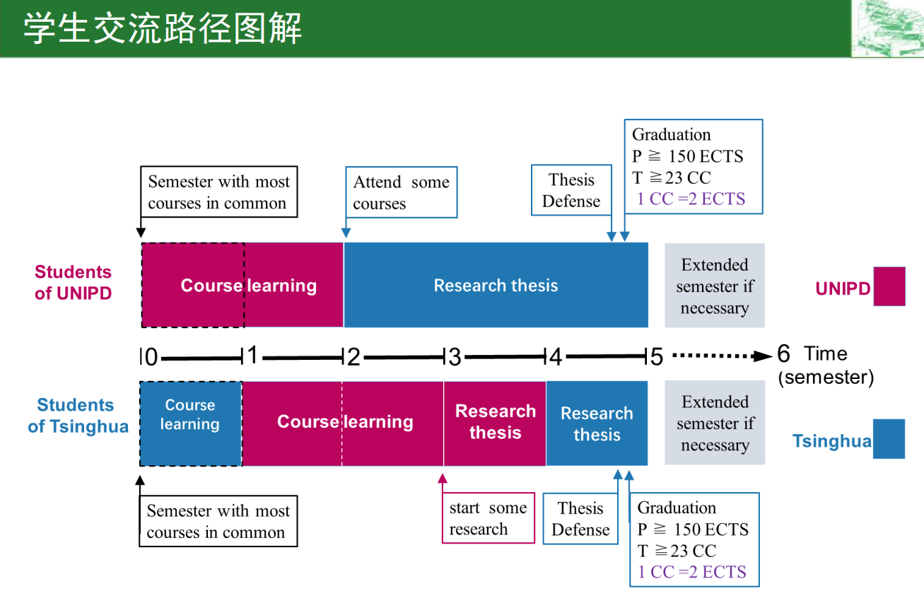 清华 - 帕多瓦双硕士学位项目旨在培养一批既熟知中国国情,又具有国际视野,同时具备实践经验的应用型专业人才,未来可成为欧洲先进环保技术向中国转移的桥梁,也可以在学习和消化欧洲先进的资源化及能源化技术的基础上,为推动中国废物资源化及能源化发挥重要作用。项目包含5个学期(2.5年,本校2学期+对方院校3学期),双方每年各派出不超过5名员工。