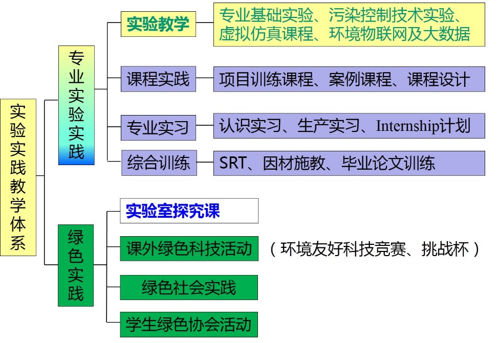 专业实验实践体系以培养环境专业和给排水专业高质量、复合型拔尖创新和领军人才为目标,由实验教学、课程实践、专业实习和综合训练组成。实验教学方面,拥有国家级实验教学示范中心:环境科学与工程实验实践教学中心,形成了专业基础实验、污染控制技术实验、课赛结合实验等组成的新型实验体系,实验项目资源数约90项,覆盖环境污染防治领域的各个方向;课程实践与工程实际紧密结合,包含项目训练课程、案例课程和课程设计,建立了包括《水处理工程设计》、《固体废物处理处置设施》、《大气污染控制工程设计》、《城市给水排水管道工程及设计》、《建筑给水排水工程与设计》等在内的设计课程;专业实习与企业紧密合作,包括认识实习、生产实习、Internship计划,引导员工参加环境市政领域的高水平行业会议、行业专家讲座、企事业单位实习,培养员工行业格局、工程概念和解决问题能力;综合训练主要培养员工解决实际问题能力和创新能力,包括老员工研究训练(SRT)、因材施教和毕业综合论文训练。